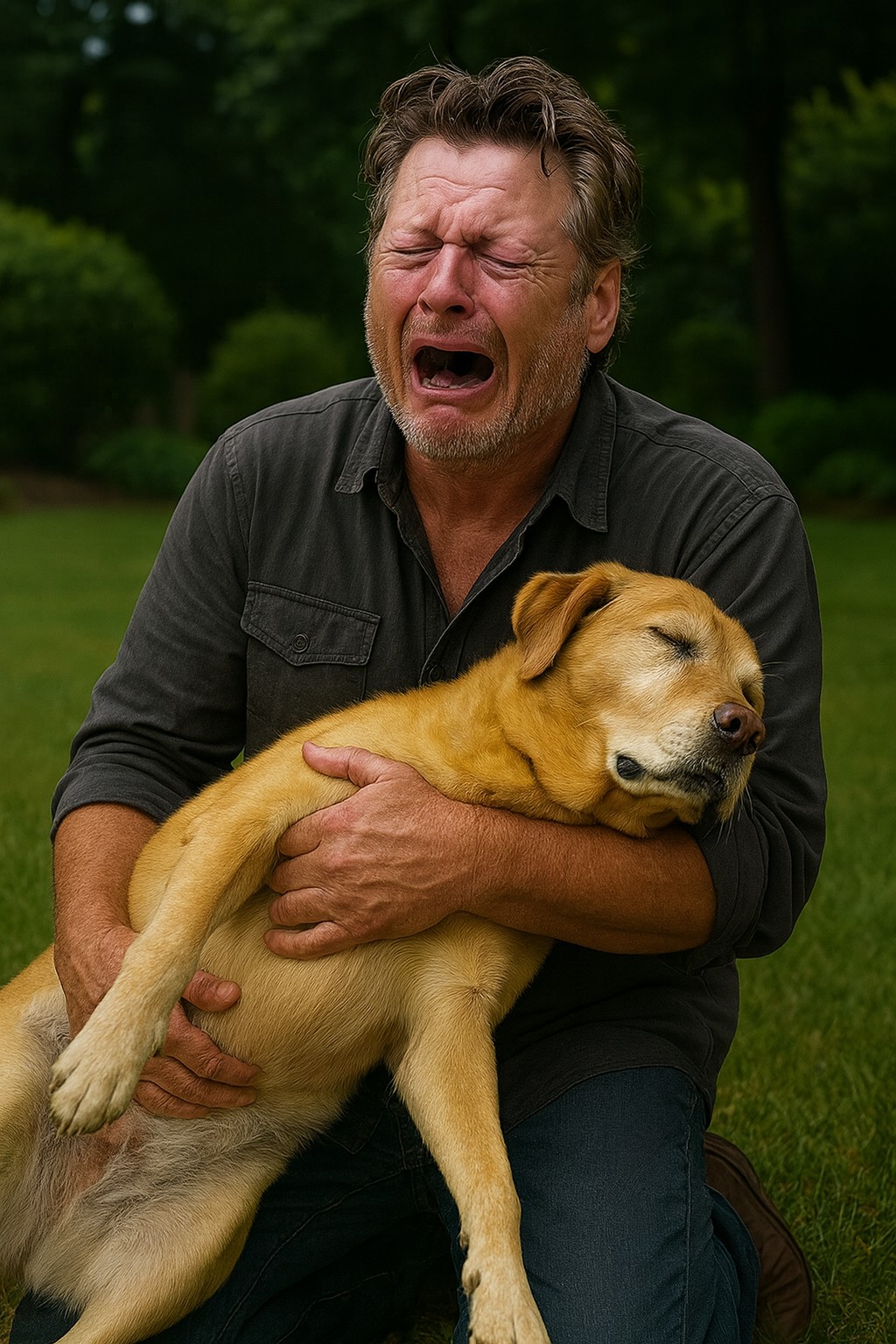 Now, the time has come for Blake to say goodbye. The man we know for his humor and strength appears smaller in this moment, holding his dog one last time. His tears fall quietly onto the golden fur that once greeted him after every show, every journey, every storm. The bond between them — built on trust, laughter, and unconditional love — was something beyond words.