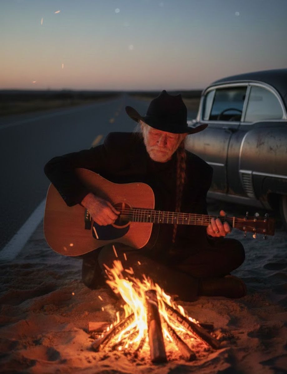 He reached into the backseat, pulled out his weathered guitar, and brushed the dust from the strings. There was no audience to impress, no technicians to please—only the wind wandering across the dunes and the steady glow of a moon that has watched more human stories than any library on earth. Under that pale light, Willie began to play “Seven Spanish Angels.”