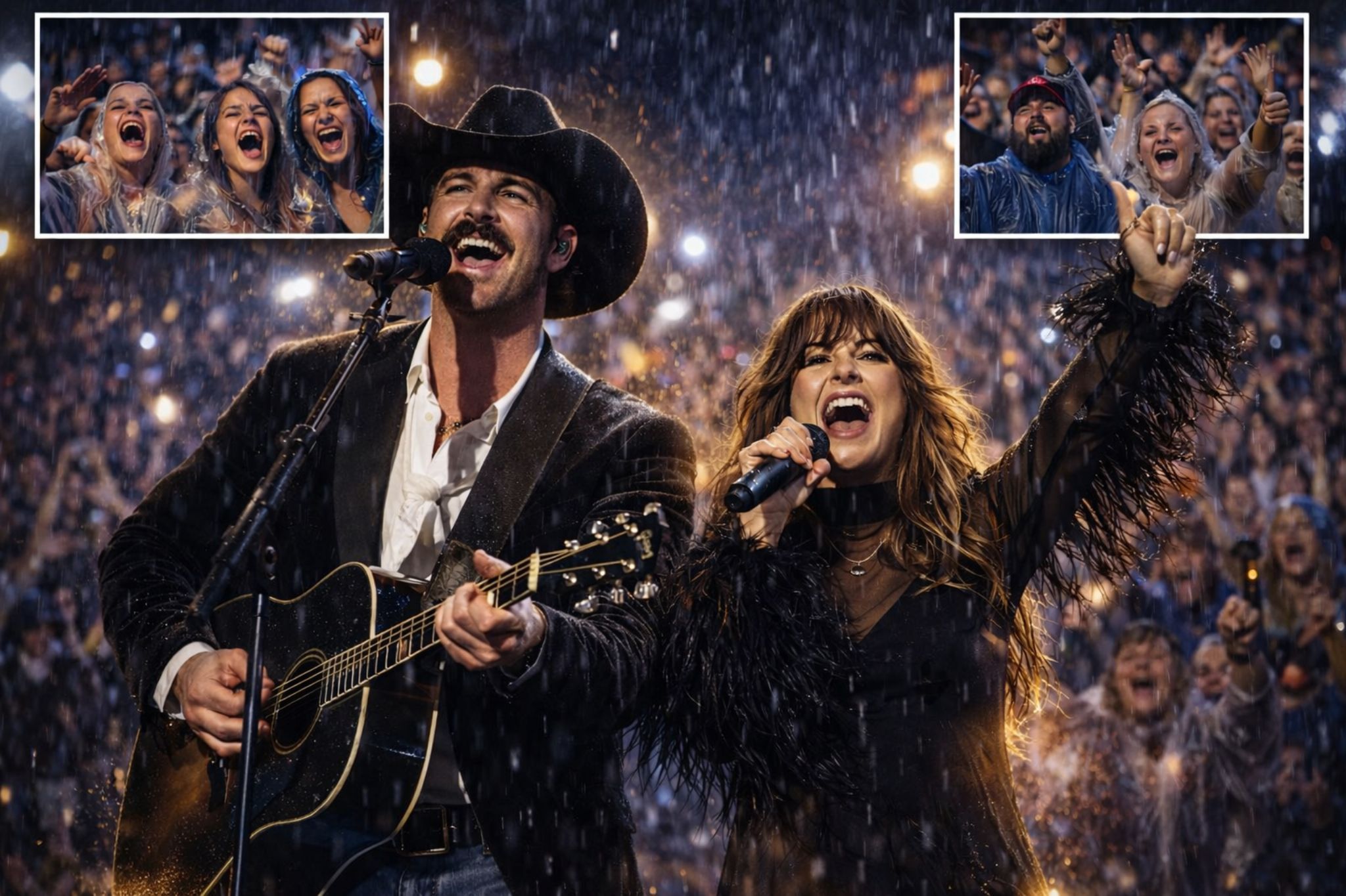 There are concert nights that start with a quiet kind of dread—the kind seasoned fans recognize immediately. The gates are open, the seats are filling, but the sky is doing its worst. Rain delays stretch longer than anyone wants. Ponchos cling uncomfortably. The air turns cold in that way that seeps through denim and patience at the same time. And somewhere in a stadium packed with tens of thousands of people, you can feel a single question moving from row to row: Is the night going to fall apart?