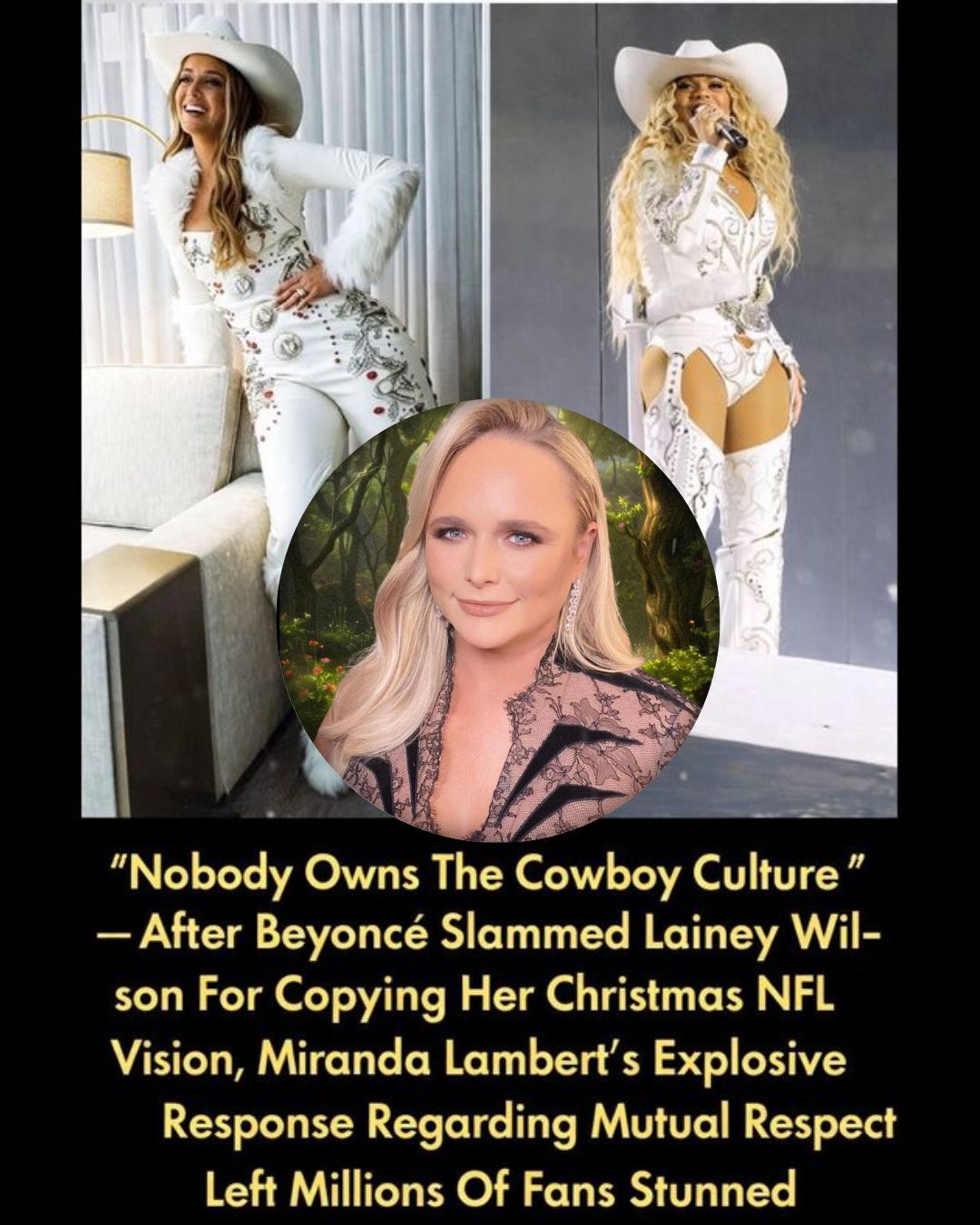What’s fascinating here is how quickly the conversation turns into something bigger than Lainey versus Beyoncé. It becomes a debate about who gets to stand where, and who gets to wear what—especially when cowboy aesthetics, Southern imagery, or “country-coded” styling enters a mainstream stage. That’s where Miranda Lambert’s phrase lands like a bucket of cold water on a room that’s getting too hot: “Nobody Owns the Cowboy Culture” — Miranda Lambert Words Stop a Brewing Feud Cold.