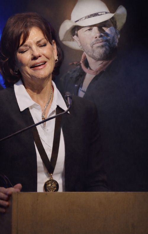Those words—delivered as Tricia Covel stepped forward to accept the medallion—carry a rare kind of emotional precision. They’re affectionate, a little witty in the way Toby himself could be, and deeply aching all at once. In that one moment, the ceremony becomes personal. You can picture the room: not chasing spectacle, but holding its breath, letting gratitude do what it always does when it’s real—soften people who thought they came in strong.