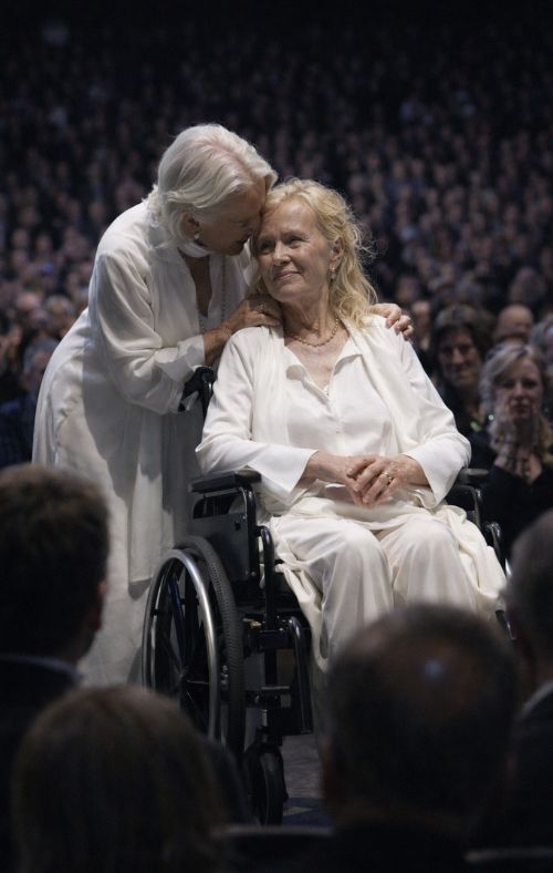 That single detail changes everything. Because it shifts the moment from performance to devotion—an act of companionship so plain, so tender, it doesn’t need explanation. There’s a particular power in seeing legends not as untouchable icons, but as human beings who have carried history in their bodies and grief in their private hours. When Anni-Frid Lyngstad places a gentle hand on Agnetha’s shoulder, the gesture speaks a language older than applause: I’m here. You’re not alone. We’ll do this together.