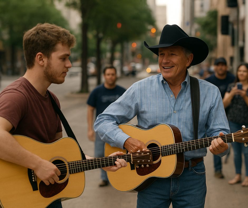 NO ONE EXPECTED IT — ON A QUIET MORNING IN AUSTIN, GEORGE STRAIT WAS WALKING DOWN CONGRESS AVENUE WHEN HE HEARD SOMETHING FAMILIAR FLOATING THROUGH THE AIR: A YOUNG BUSKER SOFTLY PLAYING “AMARILLO BY MORNING.”