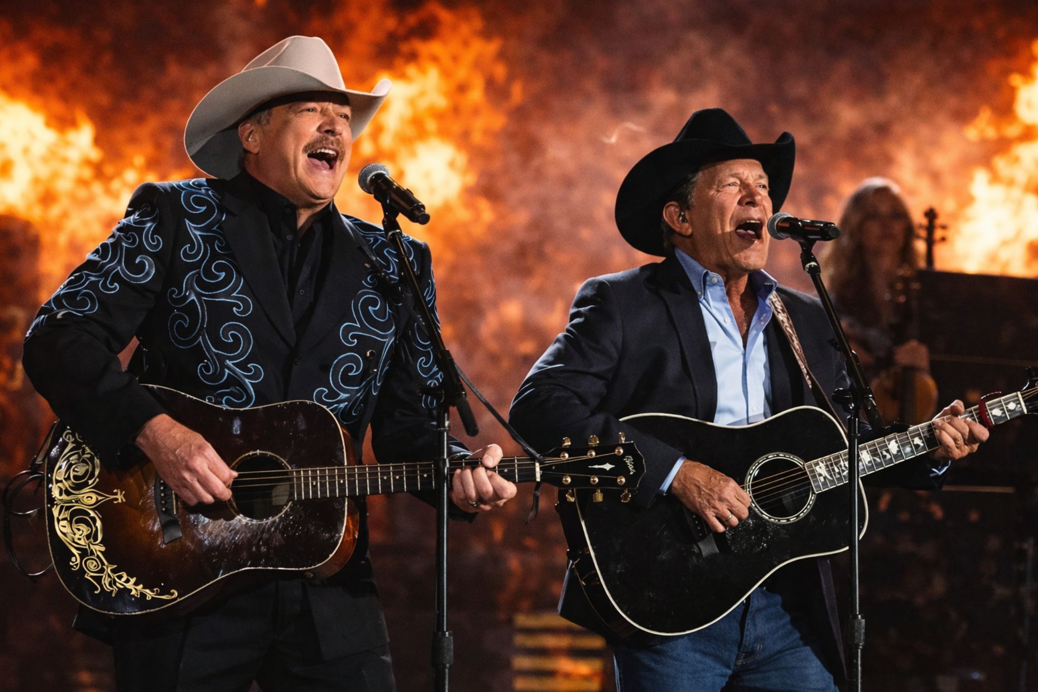 On a country stage, plenty of duets feel like a celebration—big smiles, big choruses, a crowd singing along as if the night is a reunion. But “Murder on Music Row” has never lived in that kind of energy. It feels more like a quiet reckoning, the kind that makes a room listen differently. And when Alan Jackson and George Strait stand side by side to sing it, the spotlight doesn’t need to roam—because the weight of the song does all the work.