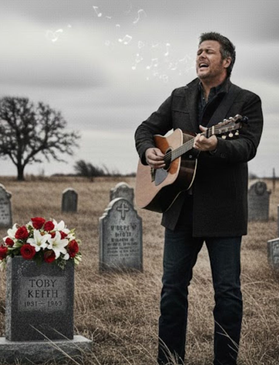 The scene was simple, but the weight of it was anything but. He stood there alone—no lights, no cameras, no crowd. Just Blake Shelton, a worn guitar, and the wind rolling across the Oklahoma plains. On the first anniversary of Toby Keith’s passing, Blake came not as a country star, but as a grieving friend with a promise left unfinished. At Toby’s grave, he began to sing the song they once wrote together—the one they never got the chance to record. The words hung heavy in the air, raw and unpolished, but full of heart. A nearby groundskeeper said they’d never heard anything so haunting, so heartbreakingly human. When the final chord faded, Blake didn’t speak. He just took off his cowboy hat, placed it gently on the headstone, and walked away without a word. What makes a man come back to where it all started, to sing for someone who’s no longer here? Maybe it wasn’t just a goodbye. Maybe it was the only way he knew how to say, “I never forgot.”