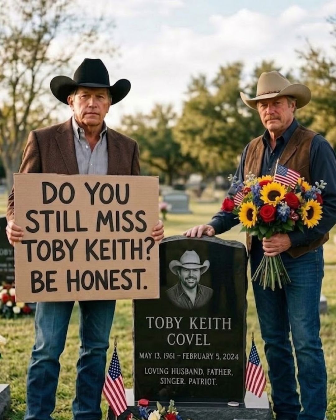 Whether read as a symbolic tribute or as an emotional portrait of what Toby Keith meant to the people who shared his road, the image is unforgettable. George Strait. Alan Jackson. Two men whose own names are carved into the history of country music. No stage. No microphones. No crowd waiting for a performance. Just the open Oklahoma night, the lowered brim of a hat, the hush of reflection, and the resting place of a man whose voice once sounded as large as the American horizon.