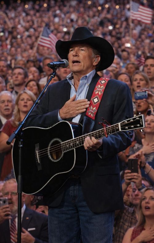 He doesn’t try to win an argument. He doesn’t turn the microphone into a weapon. He chooses something older than the disturbance and wider than the moment: a melody almost everyone recognizes, sung with the plainspoken clarity that has always been his signature. In that choice, the power isn’t in theatrics—it’s in timing. By reaching for “God Bless America,” Strait reaches for a shared cultural memory, the kind that exists beyond politics and beyond the nightly news. It’s a song that many people associate with family members who served, with ceremonies, with school auditoriums, with civic gatherings—moments where people stand up not because they are told to, but because something inside them says, this is bigger than me.