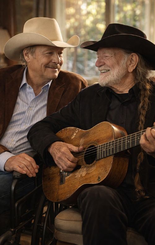 That’s why Willie Nelson’s entrance in your scene feels so fitting. Willie has never needed ceremony to say something profound. He shows up with two coffees and Trigger, his battered guitar that looks like it has lived a thousand lives. That detail matters. Trigger isn’t a prop; it’s an old companion, an instrument that has absorbed decades of road miles and quiet prayers. And when he plays “Remember When” in a sunlit room, the point is not perfection. The point is presence.