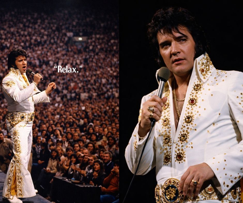 But the most fascinating detail is the simplest: one word. “Relax.” Think about the audacity of it—saying that to a crowd of 18,400 people already vibrating with anticipation. Yet this is precisely what made Elvis different. Many performers chase the crowd’s energy. Elvis shaped it. He could take a room that was ready to explode and, with a single word, bring it under control—not by force, but by assurance. “Relax” wasn’t a command delivered with arrogance. It was a promise: you’re safe now; I’ve got this.