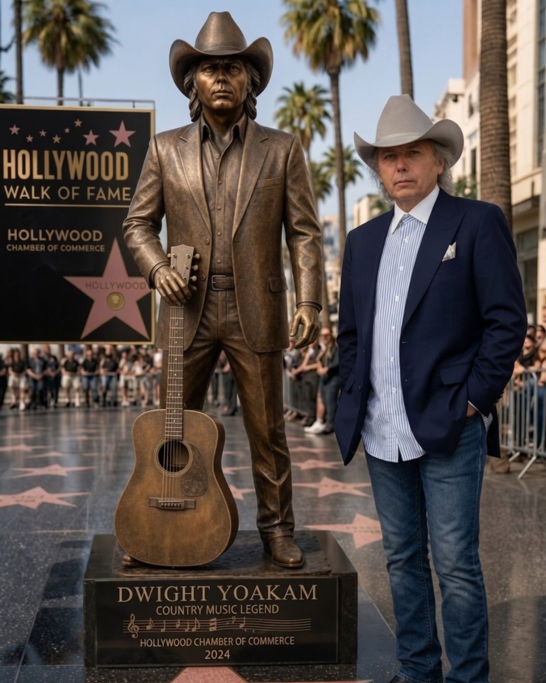 THE FIRST MUSIC ICON IN HISTORY TO BE HONORED WITH A FULL-BODY BRONZE STATUE ON THE HOLLYWOOD WALK OF FAME — AND HIS NAME IS DWIGHT YOAKAM is the kind of declaration that immediately sounds larger than a ceremony. It feels like a verdict delivered by history itself — a recognition not only of fame, but of endurance, originality, and artistic nerve.