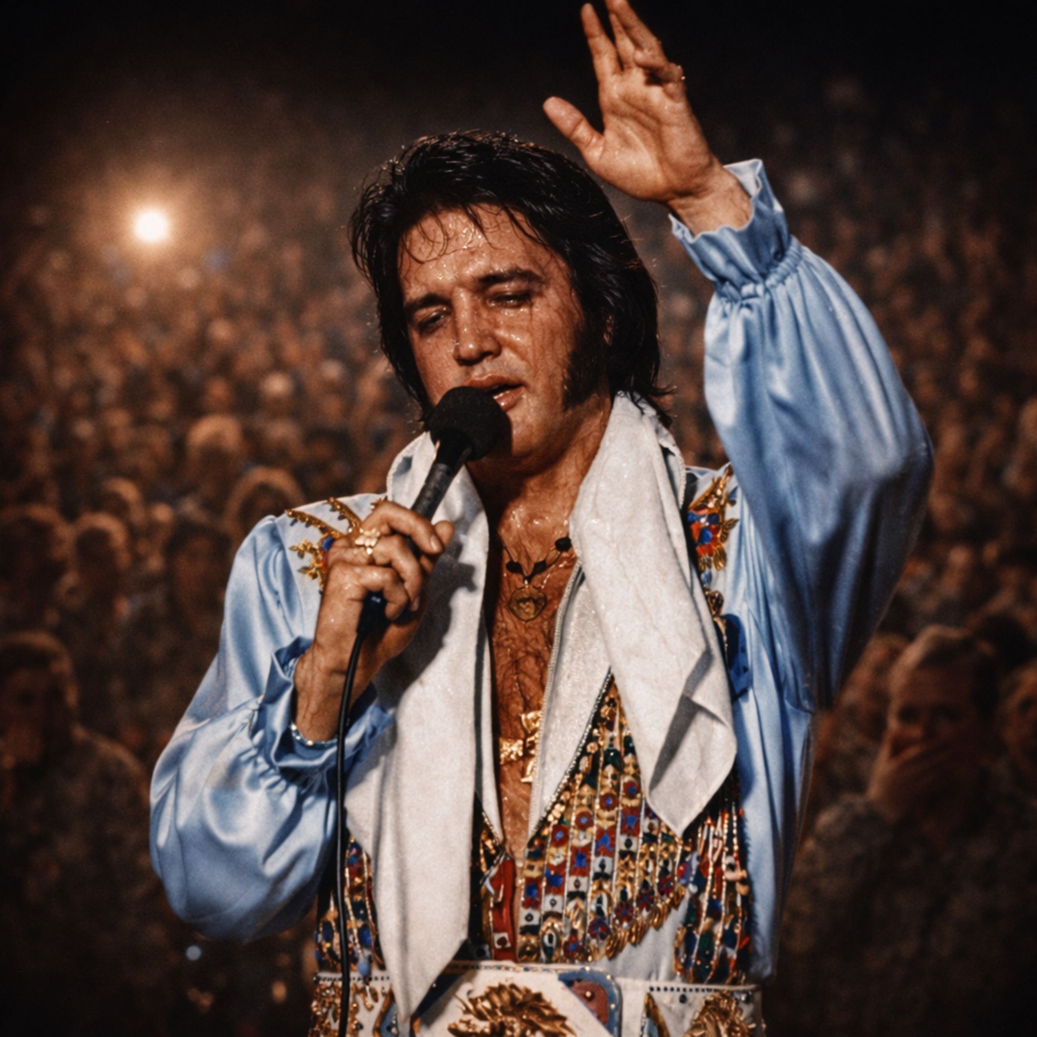 The most moving detail in this kind of scene is not that Elvis struggled. It is that he sang anyway. Witnesses remembering trembling hands, a fragile smile, and the visible effort of simply remaining under the lights only deepen the sadness of the moment. But they also deepen the dignity of it. Because when the music began, the voice was still there. Not untouched, perhaps, not effortless, but unmistakably his. That matters. Elvis did not step onto that stage as a perfect symbol preserved in time. He stepped onto it as a weary, burdened man who still knew what it meant to give the audience the only gift they had truly come for: the sound of his heart translated into song.