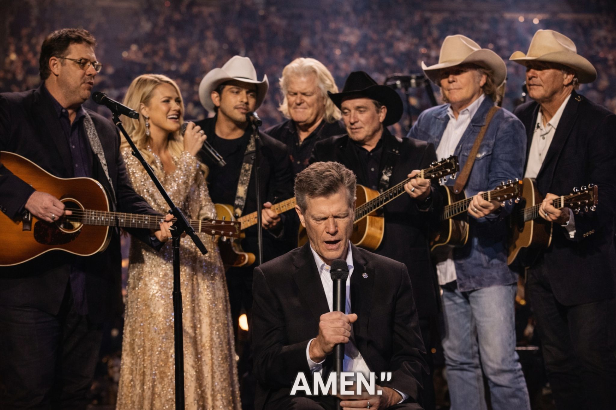 When the entire cast gathered for “Forever and Ever, Amen,” the atmosphere shifted. The song itself is pure country comfort—plainspoken, faithful, built for living rooms and long drives. And then, like a moment out of a different world, Randy Travis appeared. No gimmick. No over-explaining. Just presence. The arena rose because it had to—out of respect, out of love, out of memory. The kind of standing ovation that isn’t applause so much as a collective thank you for what you gave us.