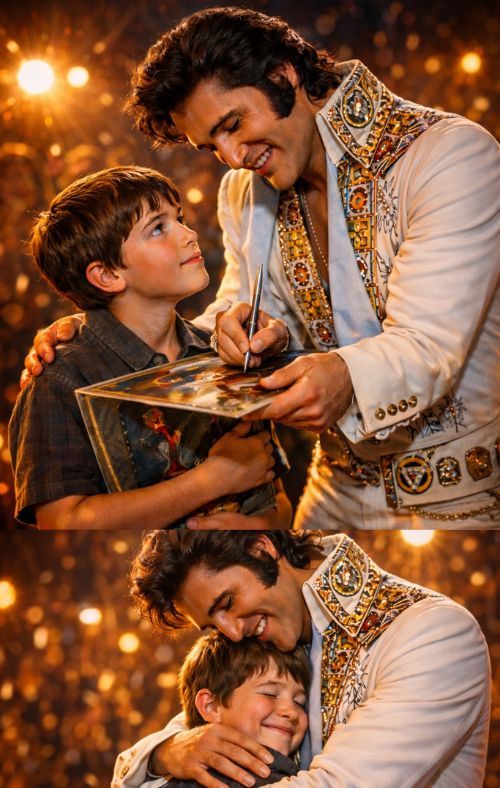 What gives this moment its emotional power is Elvis’s response. He does not rush, perform, or hide behind celebrity distance. He stops. He listens. And in that silence, one can imagine that he understood exactly what the boy was really holding out to him — not just a record sleeve, but a piece of his mother’s presence. By signing it and placing a gentle hand on the child’s shoulder, Elvis transforms a simple exchange into something deeply consoling. His words, telling the boy to keep the music close because songs can carry the people we love even when they are gone, feel timeless in their truth. Music has always done that. It preserves voices, emotions, seasons of life, and the people attached to them.