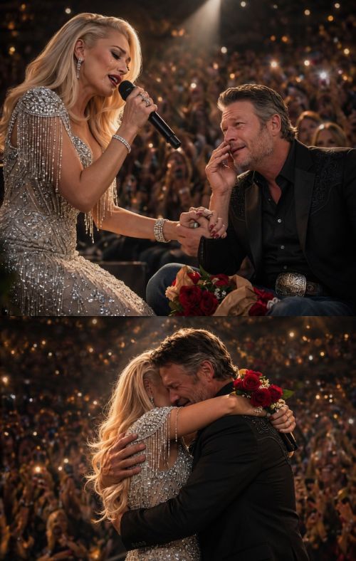 Gwen’s performance, in this imagined scene, becomes more than a song. It becomes a mirror. It reflects not only Blake’s public life, but the quieter road behind it — the disappointments, the rebuilding, the faith, the humor used as armor, and the tenderness that fame cannot fully hide.