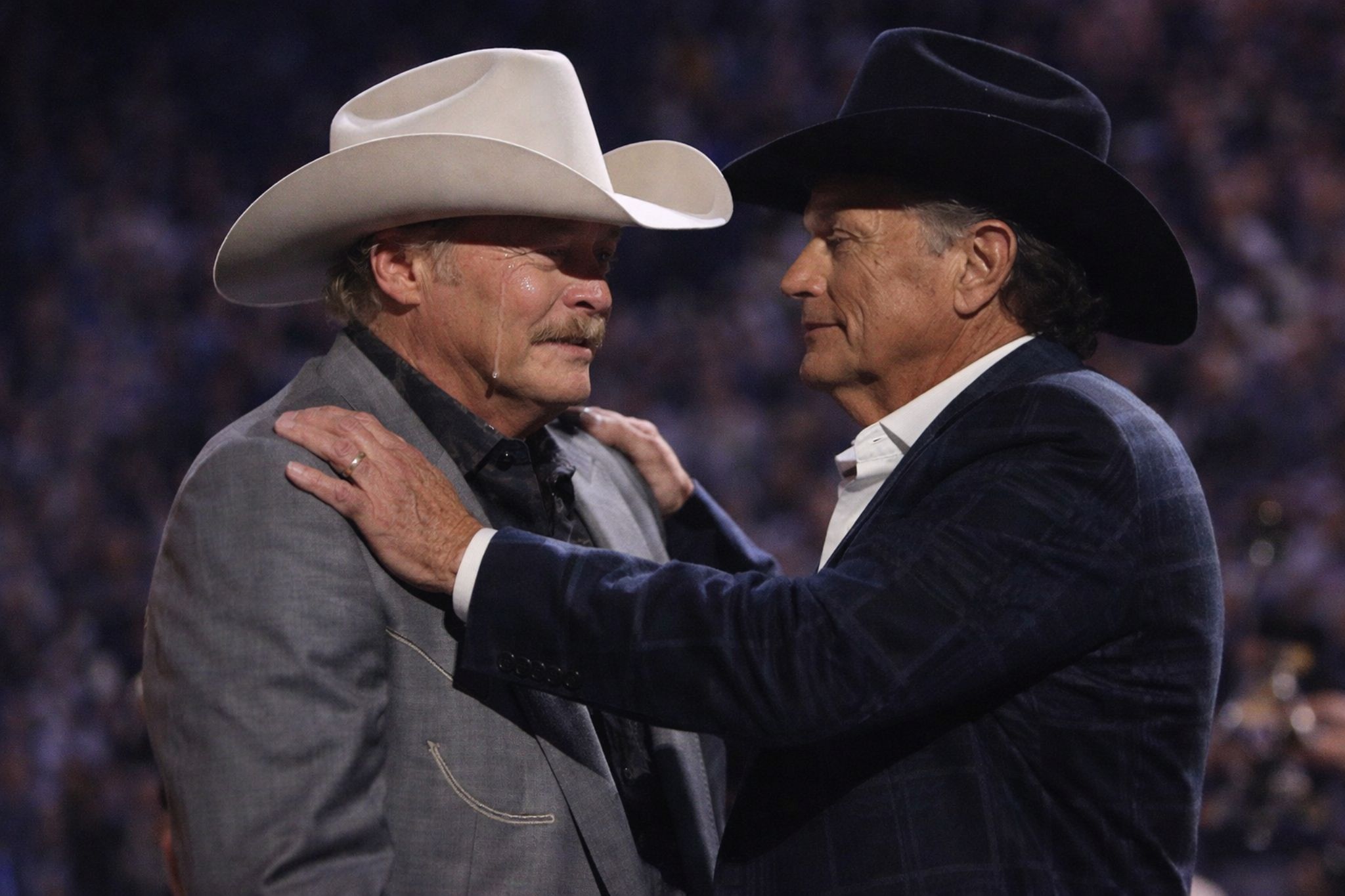 That is why The Night Nashville Stood Still: A Crown Passed in Tears? The air turned electric at the Bridgestone Arena when Alan Jackson’s voice suddenly cracked during “Remember When.” As 30,000 fans gasped, a legendary shadow emerged from the darkness. It was “The King” himself, George Strait. Without a single rehearsal or word spoken, the two icons locked eyes—and then the unthinkable happened. Tears began streaming down Alan’s face as George placed a heavy, symbolic hand on his shoulder. Was this a secret goodbye or a historic passing of the country music crown? The stadium erupted into a deafening roar that changed the industry forever. reads like the kind of story people repeat for years—because it speaks to something older listeners understand deeply: sometimes the most powerful moments aren’t planned. They arrive when emotion finally catches up with a life.