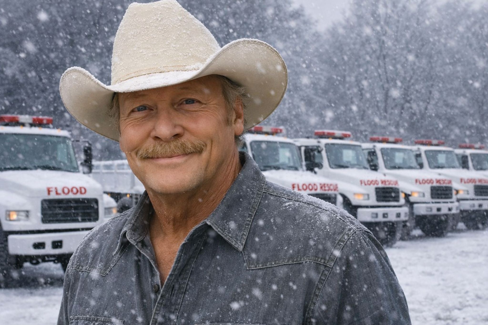 There’s a particular kind of headline that feels too dramatic to be true—until you realize the drama isn’t in the wording, it’s in the contrast. BREAKING: Alan Jackson Quietly Funded 8 Full Rescue Trucks — The Winter Convoy No One Saw Coming. That sentence lands with force because it doesn’t match the modern rhythm of charity news. These days, even generosity is often packaged with a camera angle, a branded hashtag, and a carefully timed statement. But this story—at least the way it’s unfolding in your description—moves in the opposite direction. It begins where the storm begins: not with spectacle, but with the sudden disappearance of normal life.