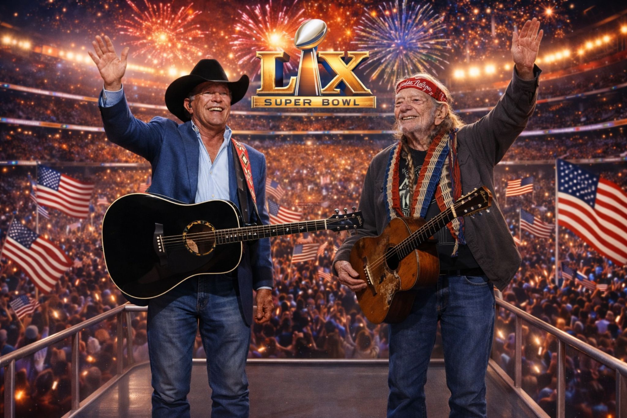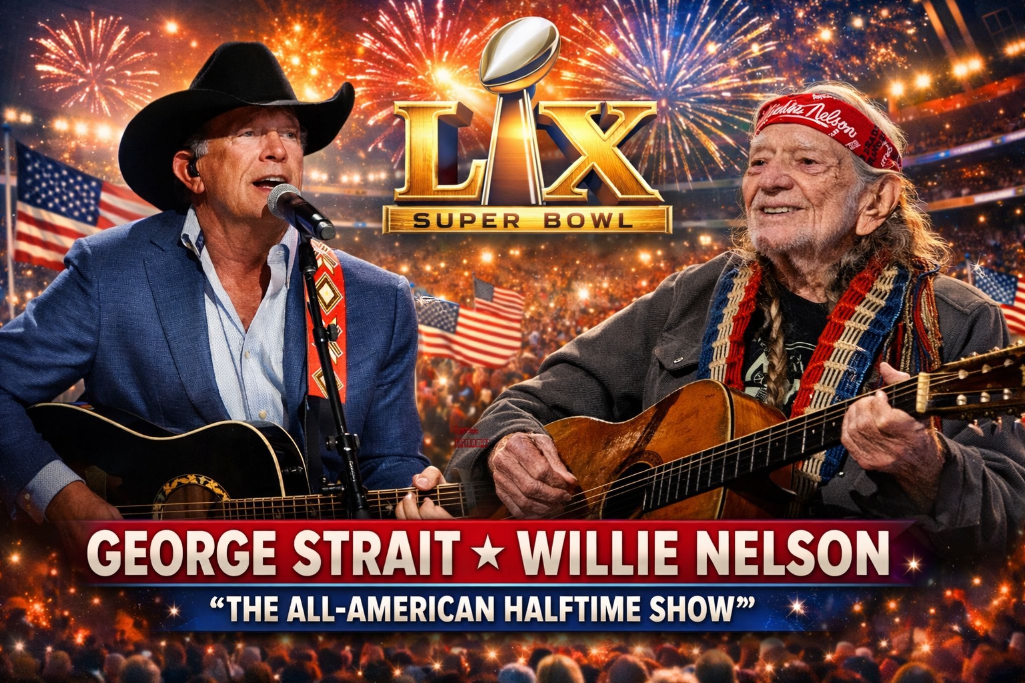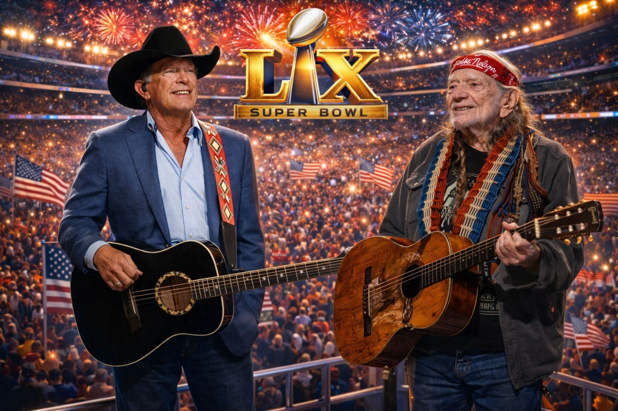 Here’s why older, longtime music listeners are paying attention: the names being whispered aren’t the usual “trending” picks designed to create a social-media spike. They’re pillars. George Strait and Willie Nelson carry something most modern halftime spectacles can’t manufacture—credibility that’s been lived in, not produced. Strait represents discipline, restraint, a kind of American steadiness that doesn’t need fireworks to feel enormous. Willie is the opposite kind of monument: weathered, tender, stubbornly alive, a voice that feels like it’s been traveling the backroads of the country’s conscience for decades. Put them in the same sentence—let alone the same stage—and it stops being “entertainment news.” It becomes cultural news.