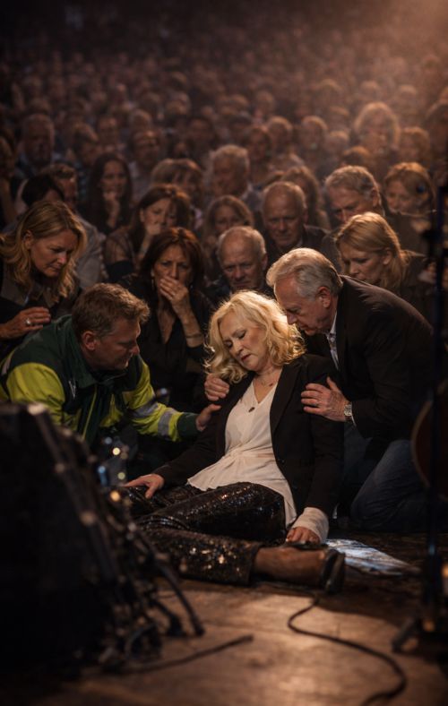 In a concert hall glowing with nostalgia and quiet reverence, no one expected the music to stop this way. For decades, Agnetha Fältskog’s voice had been more than sound — it was memory, comfort, and a bridge to youth for millions who grew up with ABBA’s timeless melodies. But on this unforgettable night in Stockholm, applause turned into stunned silence as the legendary singer suddenly collapsed mid-performance. Fans who once danced to “Dancing Queen” now watched with tears in their eyes, unsure whether they were witnessing a tragic ending or a fragile new beginning. As family members and fellow musicians rushed to her side, the stage lights seemed colder, the air heavier. This is not just a story about a moment — it is about legacy, vulnerability, and the question every devoted listener now whispers: what happens when a voice that shaped our lives suddenly falls quiet?”