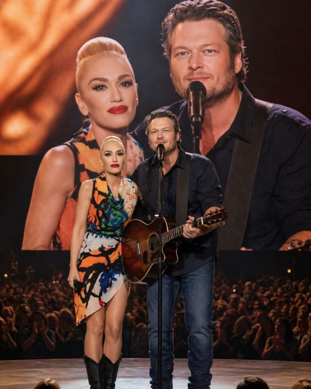 When Blake Shelton and Gwen Stefani stepped into the light, it was not only about two famous artists sharing a stage. It was about two very different musical journeys meeting in one honest place. Blake came with the warmth of country music — steady, familiar, grounded, and shaped by stories that feel close to home. Gwen came with brightness, style, emotion, and a voice listeners have known across decades of changing music. Together, they created something that felt less like a performance and more like a memory being made in real time.