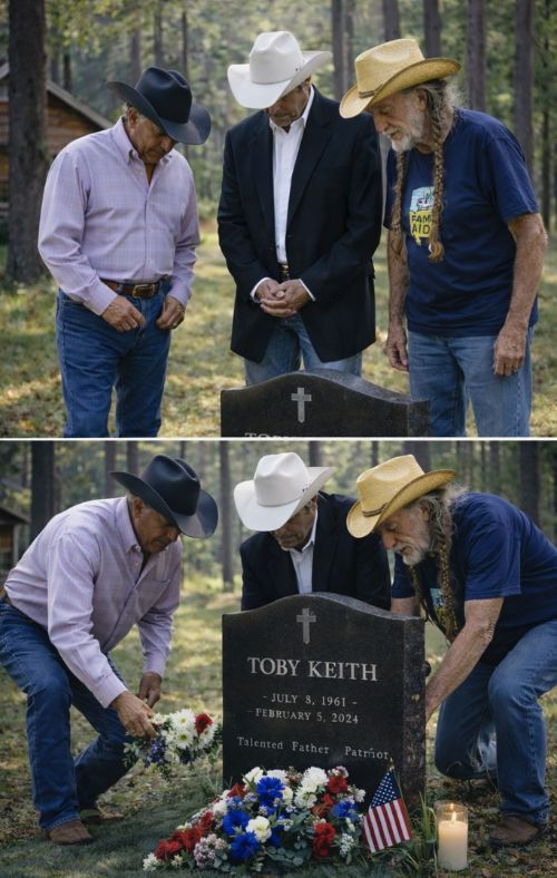 There are tributes made for cameras, and then there are tributes made for the soul. “No Cameras. No Applause. Just Three Voices in the Oklahoma Night — The Farewell Toby Keith Never Asked For, But Deserved” belongs to the second kind. It does not unfold like a headline, a broadcast special, or a carefully staged industry salute. It unfolds in stillness — the rare kind of stillness that makes memory feel almost visible. Under a dark Oklahoma sky, in the hometown that shaped Toby Keith before the world ever learned his name, the image of George Strait, Alan Jackson, and Willie Nelson arriving quietly at his memorial carries a weight no grand public event could ever match.