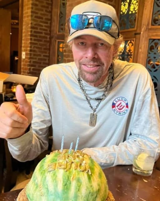 It wasn’t the stage lights or the roar of a crowd this time. Just Toby Keith, sitting quietly at home — a simple table, a watermelon-shaped cake, and a glass of water beside him. No spotlight, no guitar, no curtain call. Yet somehow, that moment carried more weight than any standing ovation ever could. He looked thinner, a little softer perhaps, but when he lifted his hand and gave that familiar thumbs-up, it felt as if the whole world held its breath.