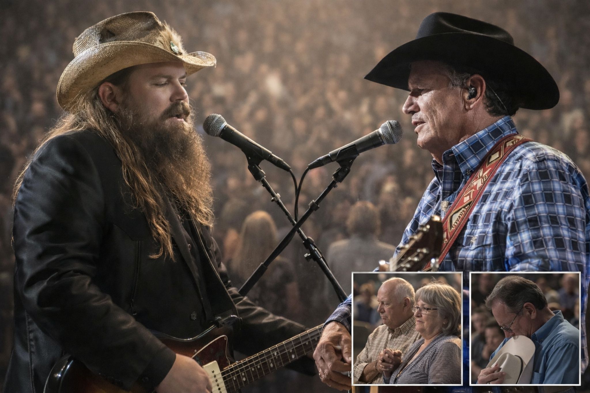 George Strait has always delivered heartbreak with restraint—never oversinging, never pleading, letting the space between lines do the heavy lifting. That calm control is exactly what makes the sorrow feel believable. Chris Stapleton, on the other hand, brings a different kind of truth: a weathered intensity that sounds like it’s been earned. Put them together, and you get a powerful balance—Strait’s quiet steadiness meeting Stapleton’s raw edge. One voice sounds like memory; the other sounds like the present moment finally admitting what it’s been holding back.