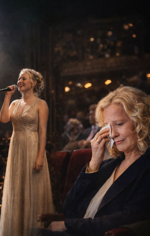 What makes this image so powerful is not simply the beauty of a daughter stepping onto a stage. It is the emotional inheritance contained in the moment. Under ordinary circumstances, a young woman singing a beloved classic might already be moving enough. But this was something else entirely. This was a daughter singing directly into the shadow—and the light—of a song forever connected to her mother’s voice. Not just any mother, but Agnetha Fältskog, one of the most recognizable and emotionally piercing voices in modern music history. That changes everything. Suddenly, the performance is no longer only about the notes. It becomes about time, memory, family, and the strange tenderness of hearing pain passed forward as art.
