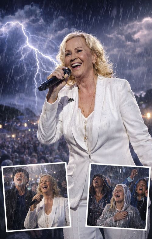Agnetha’s “bright, fearless smile” matters because it reframes the entire conversation. People love to treat time like an argument against artists. But when someone who has nothing left to prove chooses to stand under open skies—yes, even under rain—she reminds everyone that courage doesn’t always look loud. Sometimes it looks like calm presence. Sometimes it looks like a woman stepping forward, letting the storm do what storms do, while she does what she has always done: sing with dignity.