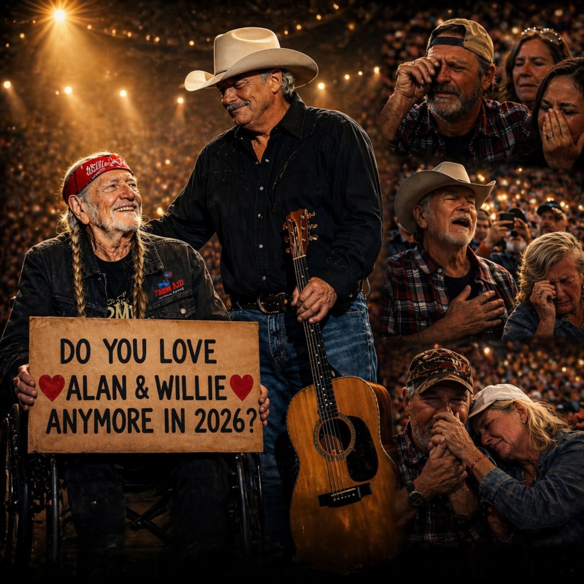 That is why ✨THE CROWD DIDN’T CHEER — THEY CRIED lands with such unusual depth. The crowd understood, perhaps almost immediately, that this was not one of those nights designed to excite. It was one of those nights meant to reveal. Willie sang first, and the image suggests that what came through was not nostalgia, but truth. Then Alan joined him—not to compete, not to elevate himself, not even to turn the song into a headline moment. He joined him to stand beside him. That distinction changes everything. In a culture that often confuses visibility with meaning, there is something profoundly moving about one artist using his voice not to dominate a moment, but to share it.