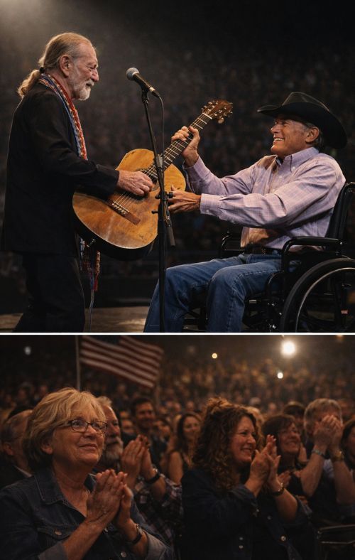 There are some moments in music that do not feel like performances at all. They feel like reckonings. They feel like memory stepping into the light, carrying age, loyalty, pain, and grace in equal measure. That is the emotional force behind The room didn’t just go quiet; the world seemed to stop breathing when Willie Nelson walked into the single spotlight beside George Strait’s wheelchair. No fanfare. No introduction. Just two titans and a lifetime of history between them.