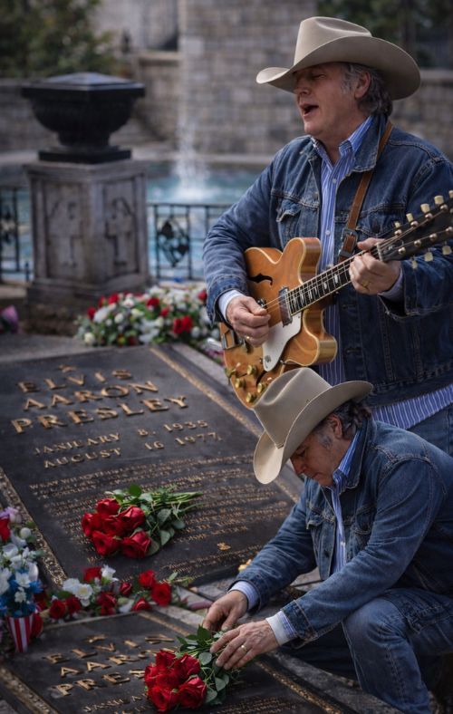 That is what makes this imagined scene so powerful. Dwight Yoakam has always carried something of the old spirit in his music—an understanding of style, mystery, restraint, and the lonely elegance that shaped so much of country and rockabilly tradition. So the thought of him standing at Elvis Presley’s grave, removing his hat, lowering his eyes, and offering One Night” into the still air feels almost painfully fitting. There is no need for an audience. No need for a microphone check, a stage cue, or a flood of lights. In a place like that, anything too polished would feel wrong. What matters is sincerity. What matters is the song, the setting, and the invisible thread connecting one artist to the man who helped make his kind of artistry possible.