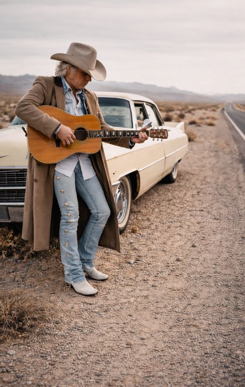 What makes this image so powerful is not spectacle, but absence. No spotlight. No cheering audience. No carefully timed encore. Just Dwight Yoakam, a lonely stretch of land, and the kind of silence that most people spend their lives trying to avoid. In that stillness, “A Thousand Miles from Nowhere” becomes more than a song title. It becomes a place, a condition of the soul, a quiet confession carried on desert air. The idea of Dwight pulling over somewhere between Reno and nowhere feels perfectly suited to the lonely elegance that has always lived inside his music. His voice has never needed excess. It has always carried a certain distance in it—something worn, restrained, and hauntingly human.