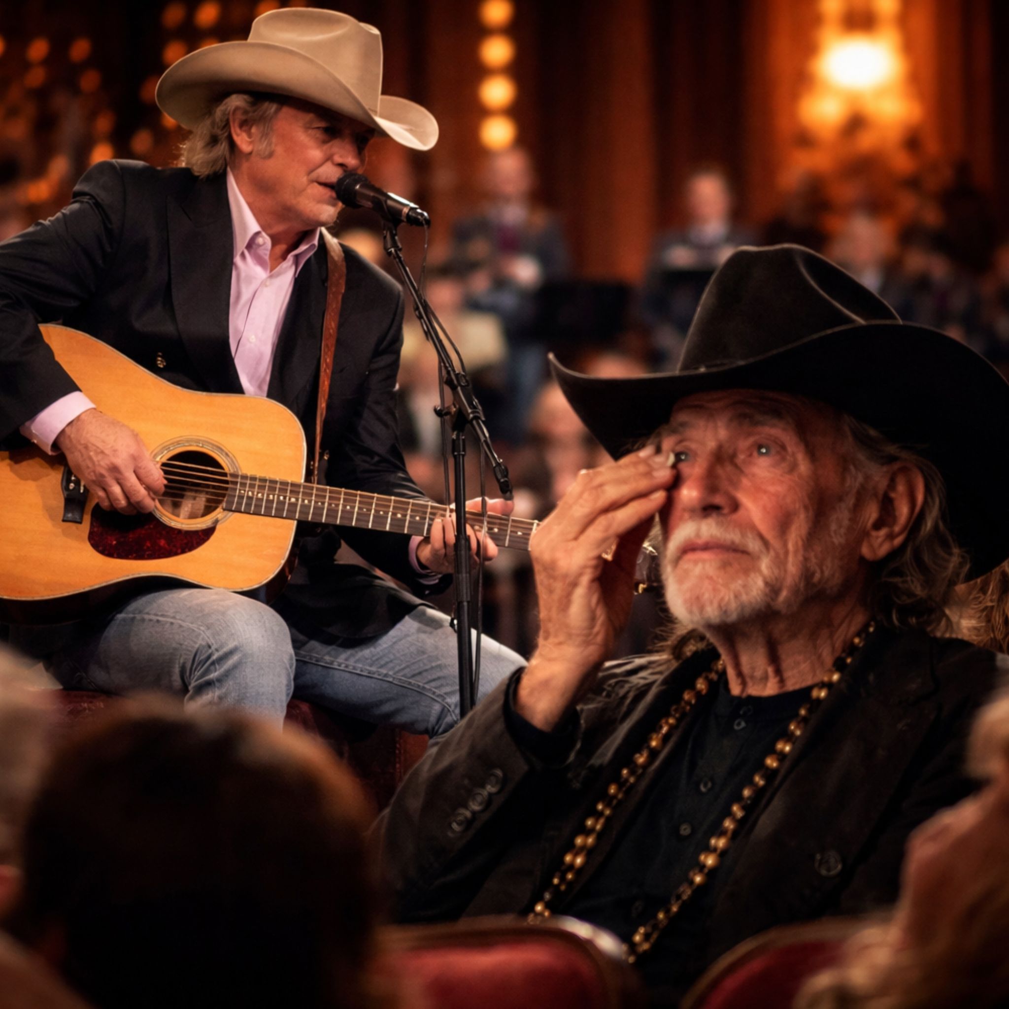 The power of a scene like this lies in its restraint. It is easy to imagine a tribute performance full of grandeur, orchestration, and ceremony. But the deepest musical honors rarely work that way. They do not overwhelm. They reveal. They strip a song back to its emotional core and allow everyone in the room to remember why it mattered in the first place. In this case, Dwight Yoakam is not simply revisiting a country classic. He is stepping into one of the most sacred emotional spaces in Willie Nelson’s catalogue — a place where pain, grace, memory, and dignity have always lived side by side.