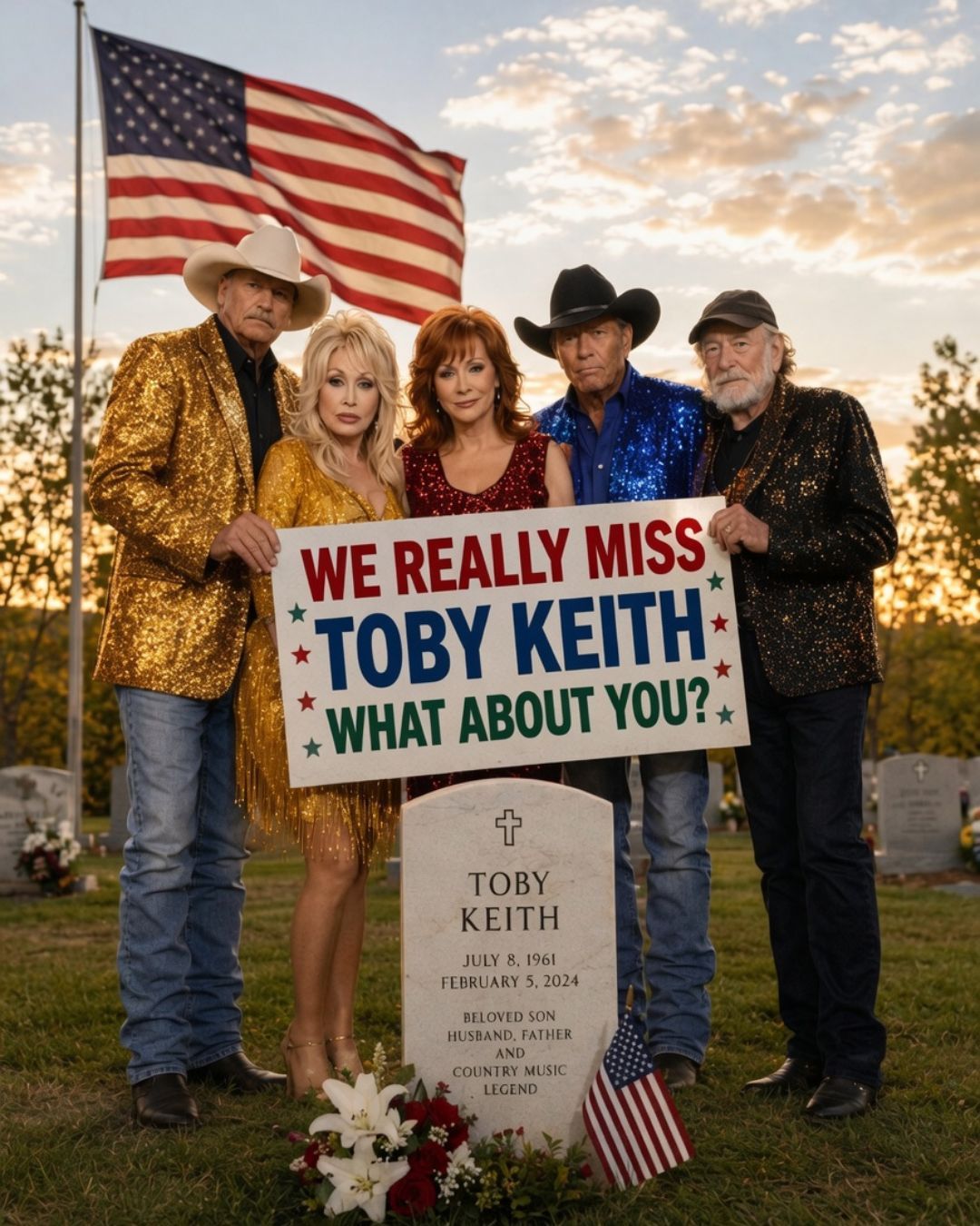The image is powerful because of its simplicity. Dolly Parton. Reba McEntire. George Strait. Willie Nelson. Blake Shelton. Five names large enough to fill any stage in America, and yet here, none of them arrive as stars first. They arrive as friends. As fellow travelers. As people who understood that Toby Keith was more than a towering figure in country music. He was a presence. A force. A man whose songs, humor, confidence, and unmistakable voice left marks not only on the industry, but on the lives of those who knew him personally and those who loved him from afar.