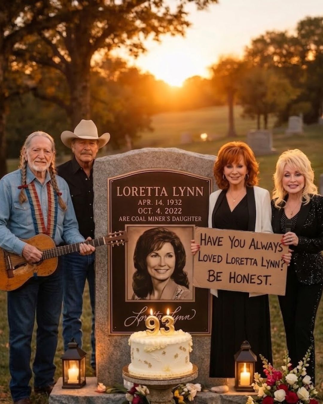 From the very first image, the scene feels almost sacred. The sun is going down over Hendersonville. Twilight settles gently over the landscape. The noise of the world seems to recede. There are no cameras trailing behind, no stage lights trying to dramatize what is already deeply moving, no public spectacle competing with the meaning of the moment. There is only the hush of evening and four legendary voices—Dolly Parton, Willie Nelson, Reba McEntire, and Alan Jackson—standing together at the gravesite of Loretta Lynn on what would have been her 93rd birthday. That picture alone holds tremendous emotional power, especially for older listeners who understand what these names have meant not just to music, but to life itself.
