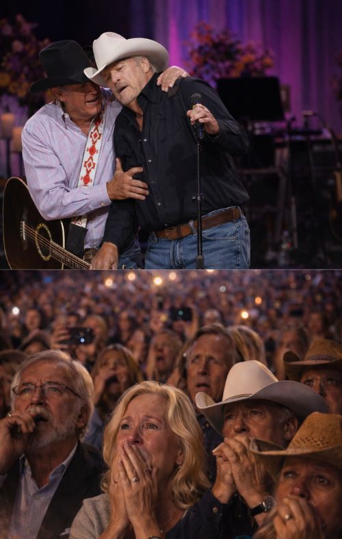 In the end, When Alan Jackson Staggered… George Strait Stepped Forward — And an Entire Arena Forgot to Breathe” is not simply a dramatic headline. It captures a moment when country music revealed its heart. Not through applause, but through stillness. Not through perfection, but through compassion. And not through the myth of two legends, but through the quiet sight of one man standing by another so the song — and the dignity behind it — could continue.