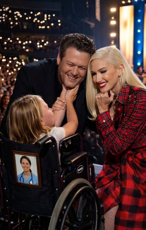 Instead, the story pivots. The performance stops being about delivery and becomes about recognition. That is what gives this scene its force. The interruption is not caused by failure, confusion, or spectacle gone wrong. It is caused by compassion. In the middle of a setting designed to elevate performers above the crowd, Gwen and Blake are imagined noticing a child in a wheelchair holding a photograph of her late mother—a nurse, a frontline figure, and a symbol of grief too deep to be reduced to a passing camera shot. In that instant, the broadcast changes shape. What had been arranged as entertainment becomes something intimate, fragile, and unmistakably human.