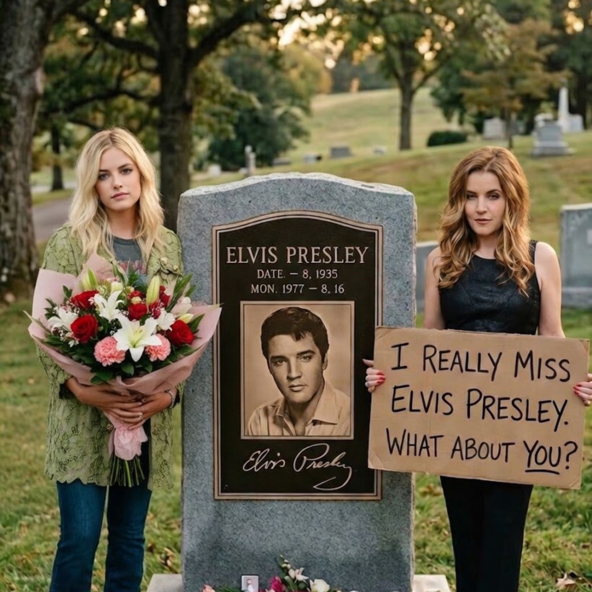 For older audiences especially, the emotional resonance runs deep. Elvis Presley was never simply a singer people admired from afar. He was part of the architecture of an era. His voice arrived in the lives of millions when they were young, and for many, it never really left. His songs moved through courtships, road trips, dances, heartbreaks, marriages, and the many quiet hours that later become the moments people miss the most. That is why seeing his daughter and granddaughter stand before his resting place feels larger than a family scene. It feels like the meeting point of private grief and public memory.