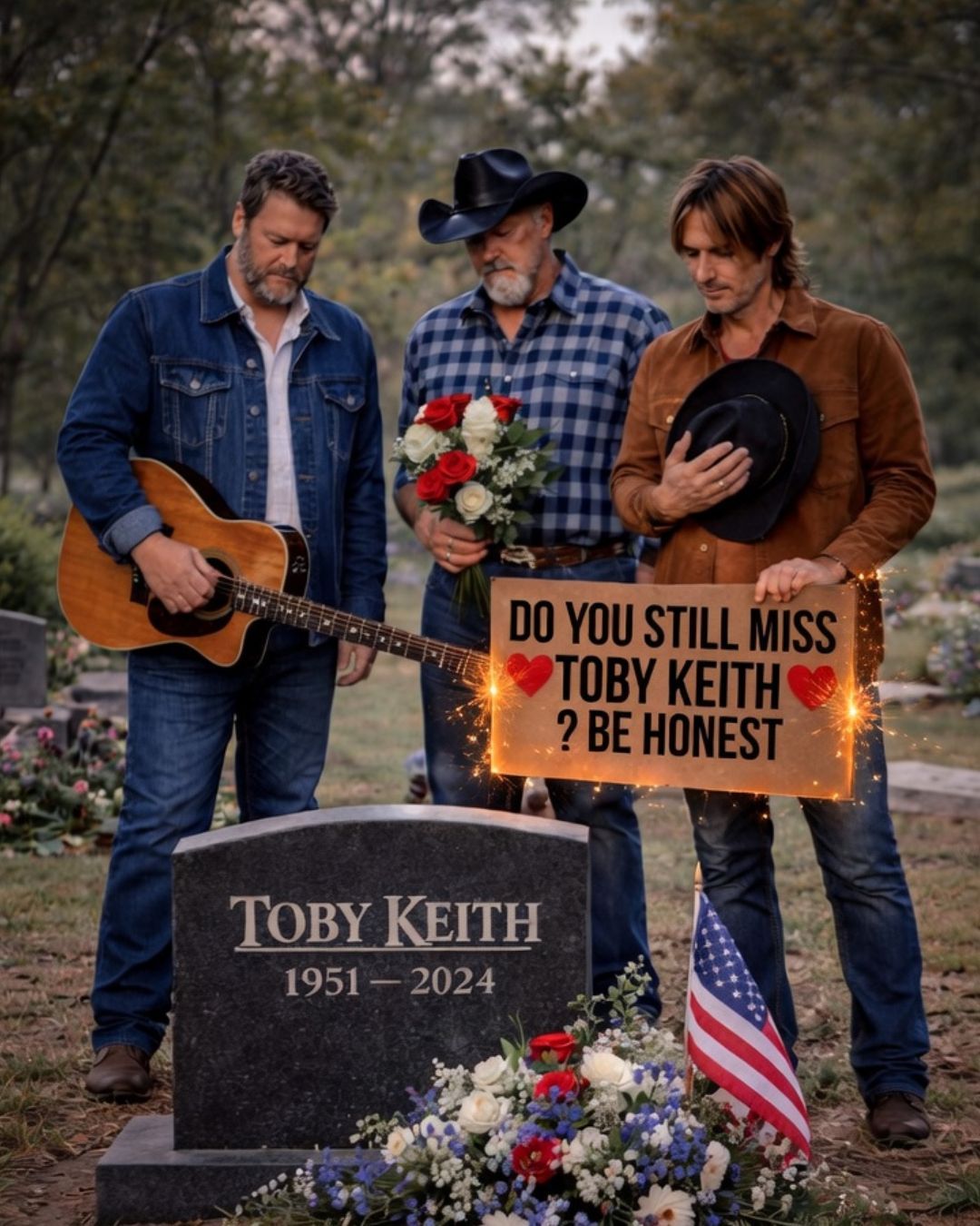 There is something especially moving about imagining Blake Shelton, Keith Urban, and Trace Adkins returning quietly to Norman not as public figures, but as men bound by years, songs, and shared history. In that setting, celebrity disappears. What remains is memory. What remains is the kind of bond that can survive sold-out shows, passing decades, and even death itself. The image is powerful not because it is loud, but because it is so restrained. No stage lights. No applause. No polished tribute arranged for broadcast. Just Oklahoma air, open darkness, and three voices carrying the absence of one they loved.
