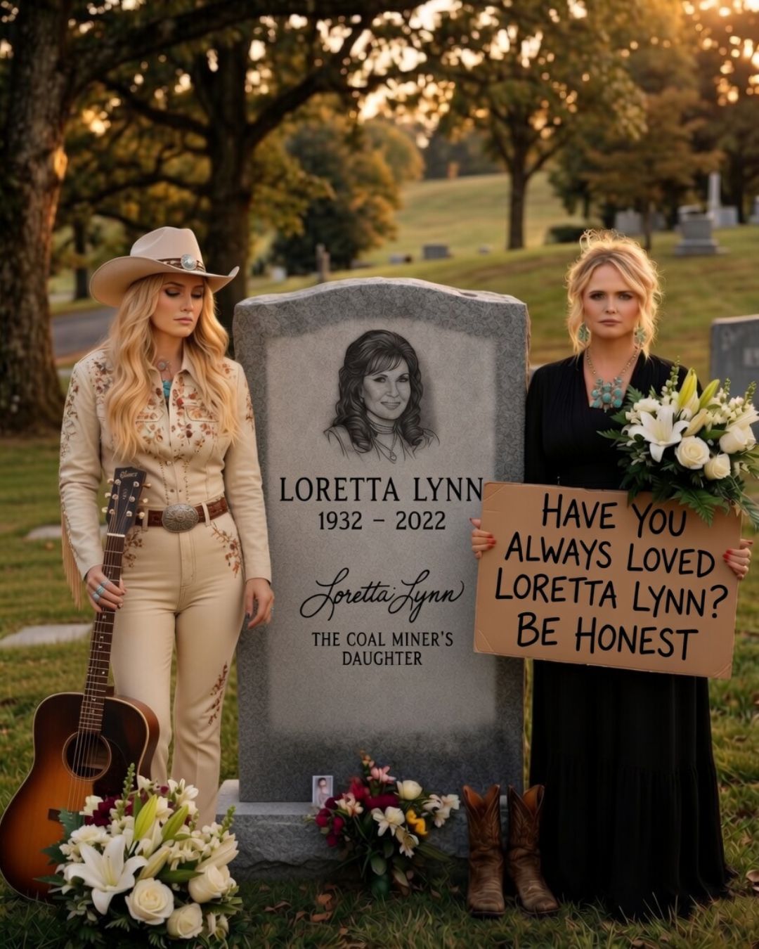 Some moments in country music do not need a microphone to become unforgettable. They do not require a packed arena, a television special, or even a single note sung in perfect time. They live in stillness. They live in memory. They live in those rare, almost holy pauses when the world seems to understand that something greater than performance is taking place. That is the emotional force behind this image of Miranda Lambert and Carrie Underwood standing in silence before the resting place of Loretta Lynn. It is not merely moving. It feels deeply symbolic, as though country music itself had come home to kneel before one of its truest mothers.