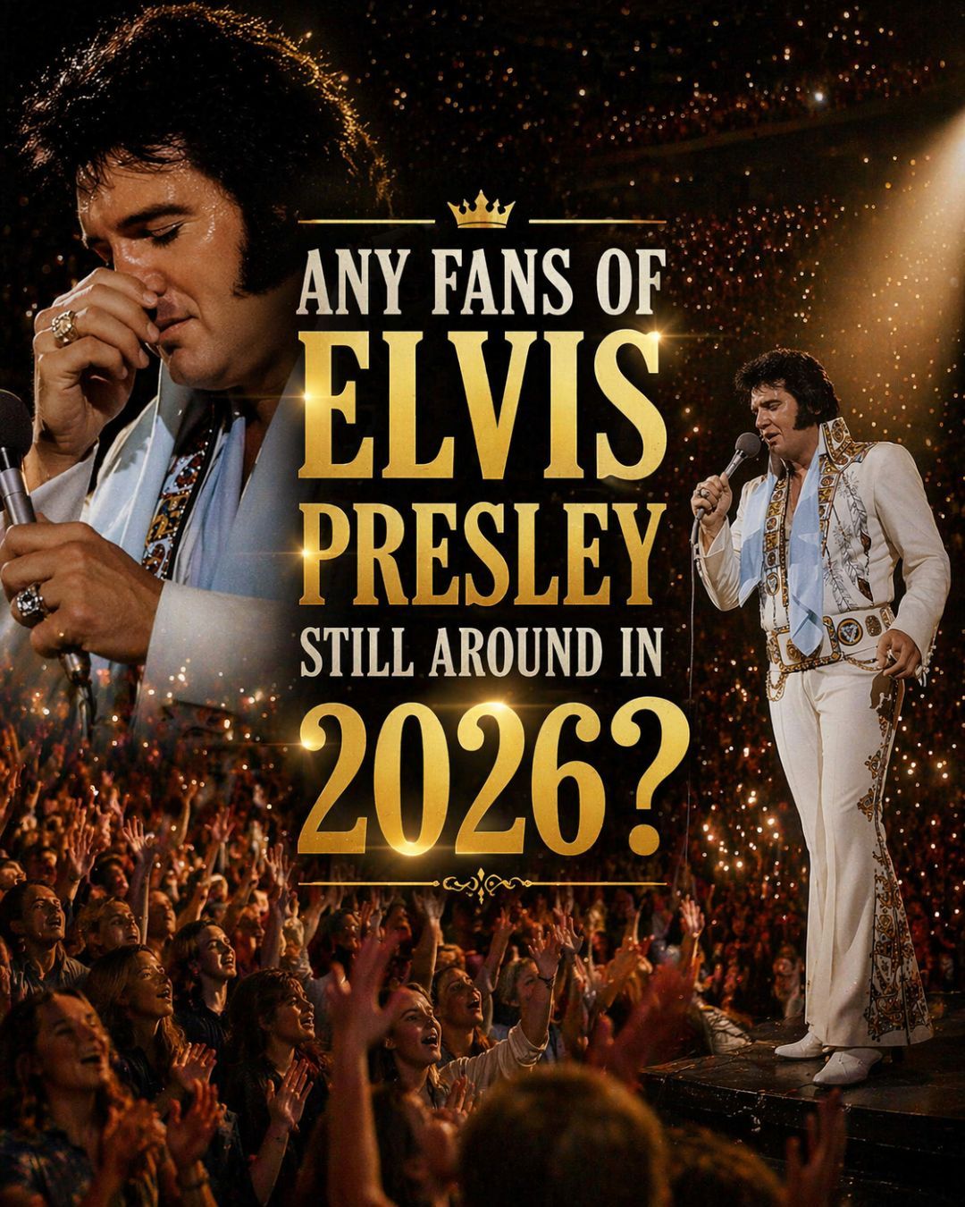 For older listeners especially, this kind of image lands with enormous force. They understand what it means when memory becomes too full for words. They understand that there are moments when a song is no longer just a melody or a lyric. It becomes a lifetime. It carries years of longing, years of devotion, years of private meanings that only deepen with time. In that one unfinished moment, Elvis is no longer just the star beneath the lights. He becomes a man standing inside the emotional echo of everything he had ever meant to the people before him.