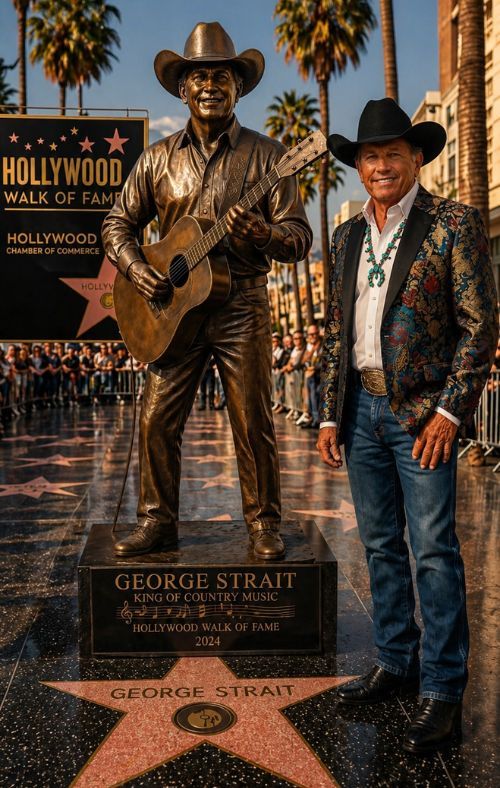 THE FIRST MUSIC ICON IN HISTORY TO BE HONORED WITH A FULL-BODY BRONZE STATUE ON THE HOLLYWOOD WALK OF FAME — AND HIS NAME IS GEORGE STRAIT is the kind of headline that immediately makes people stop, look twice, and remember why some artists are not simply famous — they become permanent fixtures in the emotional life of a nation. Whether imagined as a grand symbolic tribute or celebrated as a larger-than-life cultural moment, the image of George Strait standing proudly in bronze carries a weight that feels deeply earned.