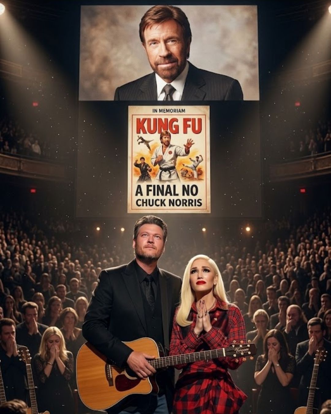 That is why THE ROOM FELL SILENT: Blake Shelton AND Gwen Stefani’S TRIBUTE TO Chuck Norris BECAME A GOODBYE NO ONE WAS READY FOR resonates as more than a dramatic line. It suggests the emotional truth of what happens when public admiration meets private feeling. A tribute may begin as an act of honor, but sometimes it becomes something else in the room. It becomes an acknowledgment of time. Of legacy. Of the reality that even the strongest figures eventually become memories carried by others. For audiences old enough to know what true legends mean, that realization lands hard.
