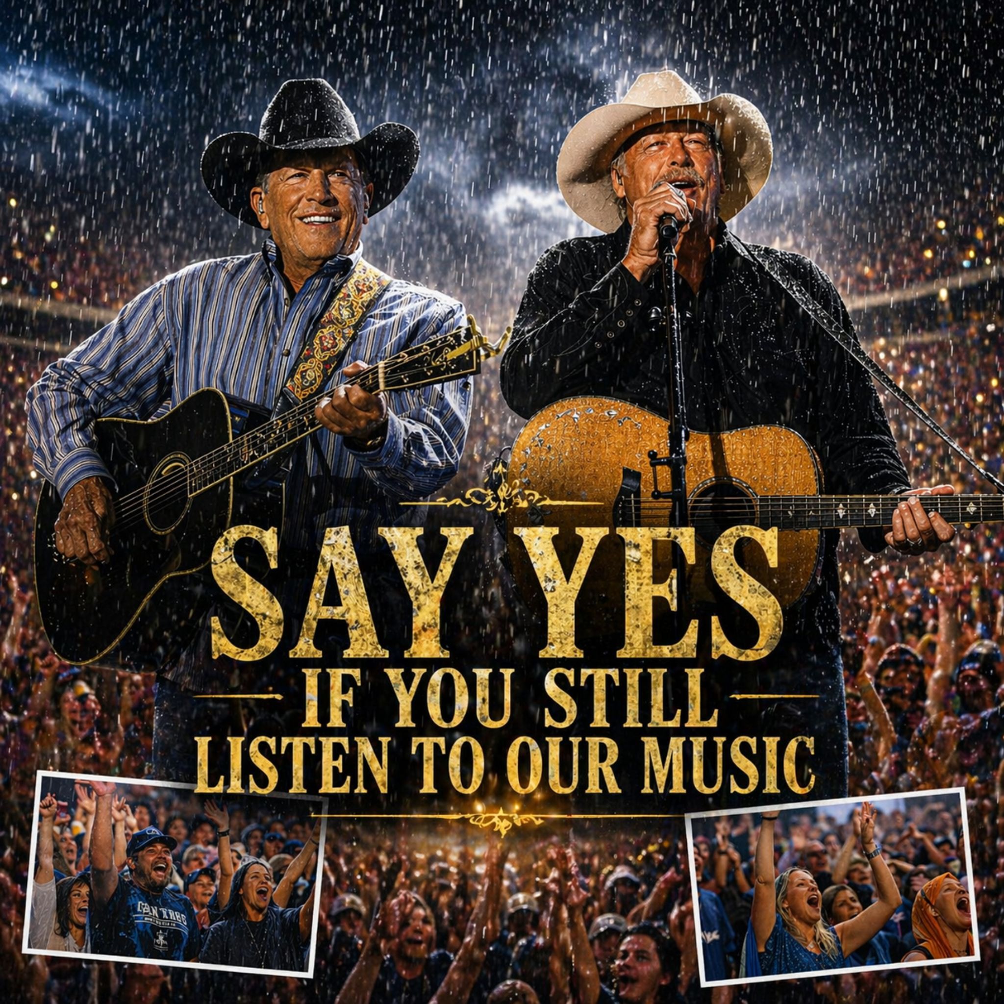 That is what makes 40,000 PEOPLE GOT SOAKED—THEN ALAN JACKSON & GEORGE STRAIT DID SOMETHING THE STADIUM WILL NEVER FORGET feel larger than a concert story. It feels like a portrait of trust. Alan Jackson has always carried the emotional weight of ordinary people in his voice. He sings with the steady honesty of someone who understands disappointment, endurance, and grace without ever needing to decorate them. George Strait, in his own quiet and commanding way, represents something equally dependable. He brings calm. He brings control. He brings the kind of presence that can steady a room—or, in this case, an entire stadium. Put those two voices together under ideal conditions, and the result is already meaningful. Put them together in the rain, before 40,000 soaked fans who are unsure whether the night can still be saved, and the result becomes something much deeper.