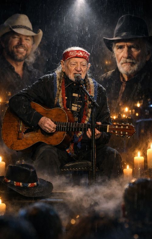 There are performances that entertain, and then there are performances that seem to suspend time. “THE NIGHT THE RAIN FELL WITH WILLIE — AND ‘PANCHO AND LEFTY’ BECAME A GOODBYE TO TOBY KEITH AND MERLE HAGGARD” belongs firmly to the second kind. It is the sort of moment that stays with an audience not because of spectacle, but because of the emotional truth carried in every note. What began as a familiar country standard became something far deeper: a quiet act of remembrance, an unwritten elegy, and a powerful reminder of how music can hold the voices of those who are gone.