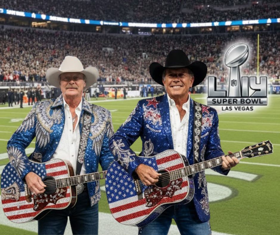On a night usually defined by noise, spectacle, and relentless motion, something rare happened. WHEN AMERICA STOPS CLAPPING — AND REMEMBERS HOW TO LISTEN was no longer just a phrase; it became a lived experience. Under the brightest lights of the Super Bowl, where expectations lean toward volume and visual excess, the appearance of George Strait & Alan Jackson offered something profoundly different — restraint, reverence, and truth.