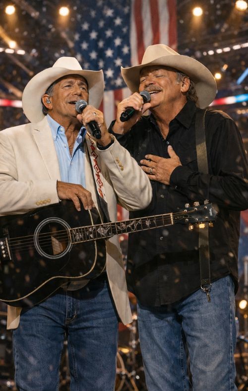 The title says it plainly, and yet it still feels impossible: “A Song That Silenced the Noise”: A Dramatized Night When George Strait & Alan Jackson Chose Unity Over Anger 🇺🇸. In a culture trained to expect escalation—hot takes, clapbacks, security rushing in—this story lands like a quiet interruption. Not because it pretends conflict doesn’t exist, but because it imagines a different ending. An ending that older, thoughtful listeners often wish we still believed in: the idea that dignity can be louder than outrage, and that music can still do what speeches sometimes cannot.