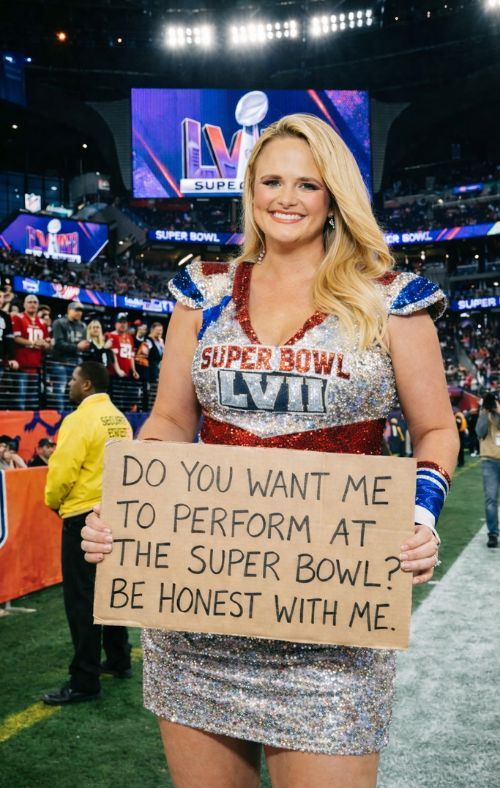 The Super Bowl halftime show has trained us to expect excess—bigger screens, louder drums, brighter surprises, and a pace that never lets you breathe. That’s why this imagined scene lands with such force: not because it tries to outshine the spectacle, but because it refuses to compete with it. In your opening, the stadium goes dark, and the power is not in what appears—it’s in what disappears. The dancers, the fireworks, the engineered chaos… gone. In their place: one warm spotlight, one acoustic guitar, and Miranda Lambert walking to a lone stool with the calm authority of someone who knows silence can be the loudest sound in the room.