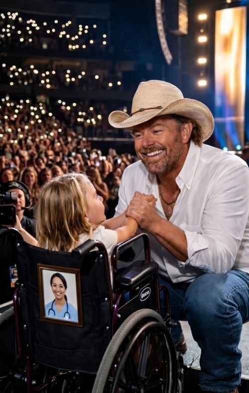In that sense, the image of Toby Keith stepping away from the teleprompter and coming down from the stage carries enormous symbolic weight. A stage, after all, creates distance. It elevates the artist and separates him from the crowd. But in this story, that distance collapses. The star comes down. The spectacle gives way to compassion. And television, with all its polish and noise, becomes a vessel for something startlingly intimate. That is why the scene feels so powerful in the imagination. It suggests that for one brief moment, fame stopped performing and started listening.