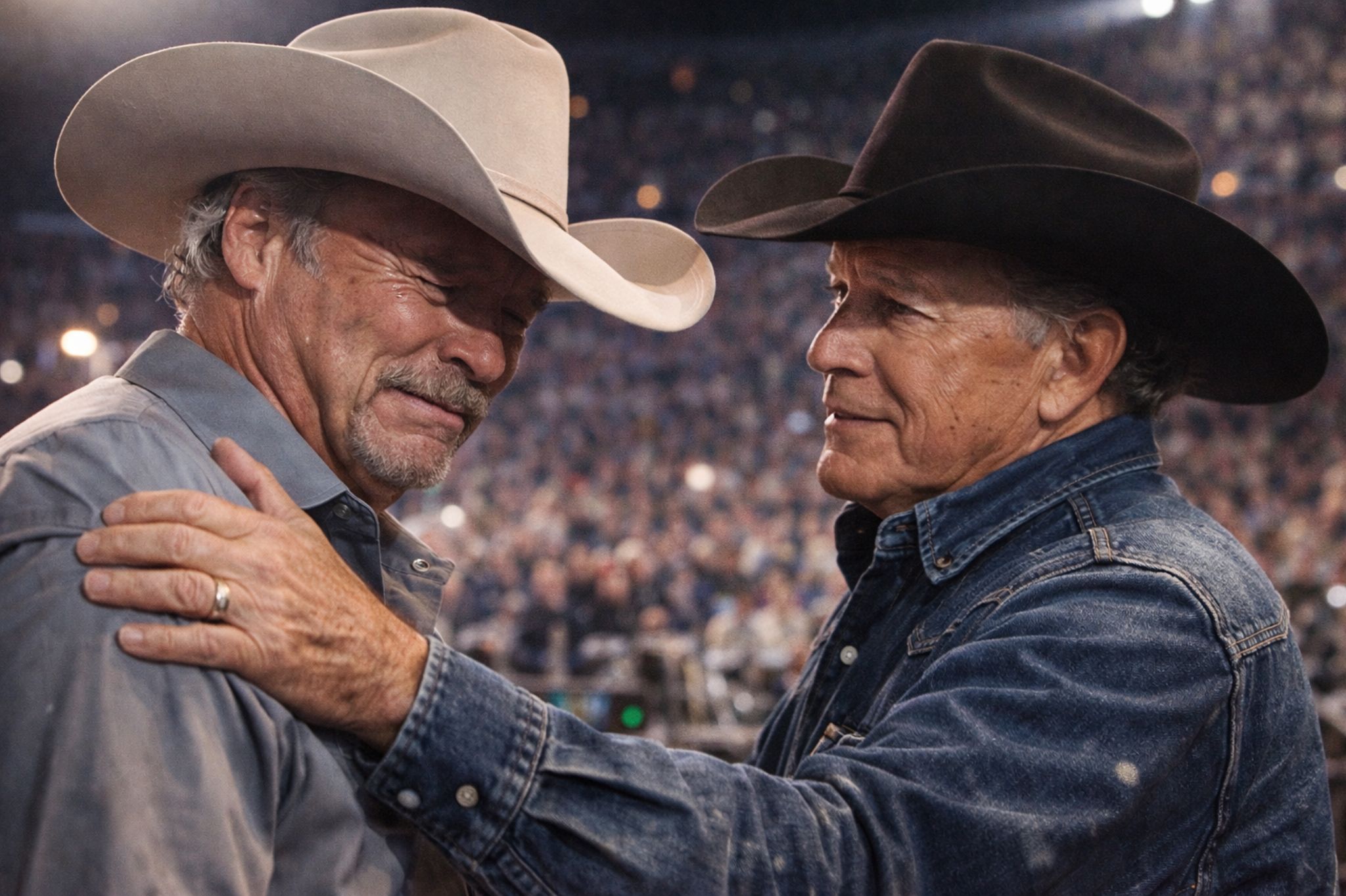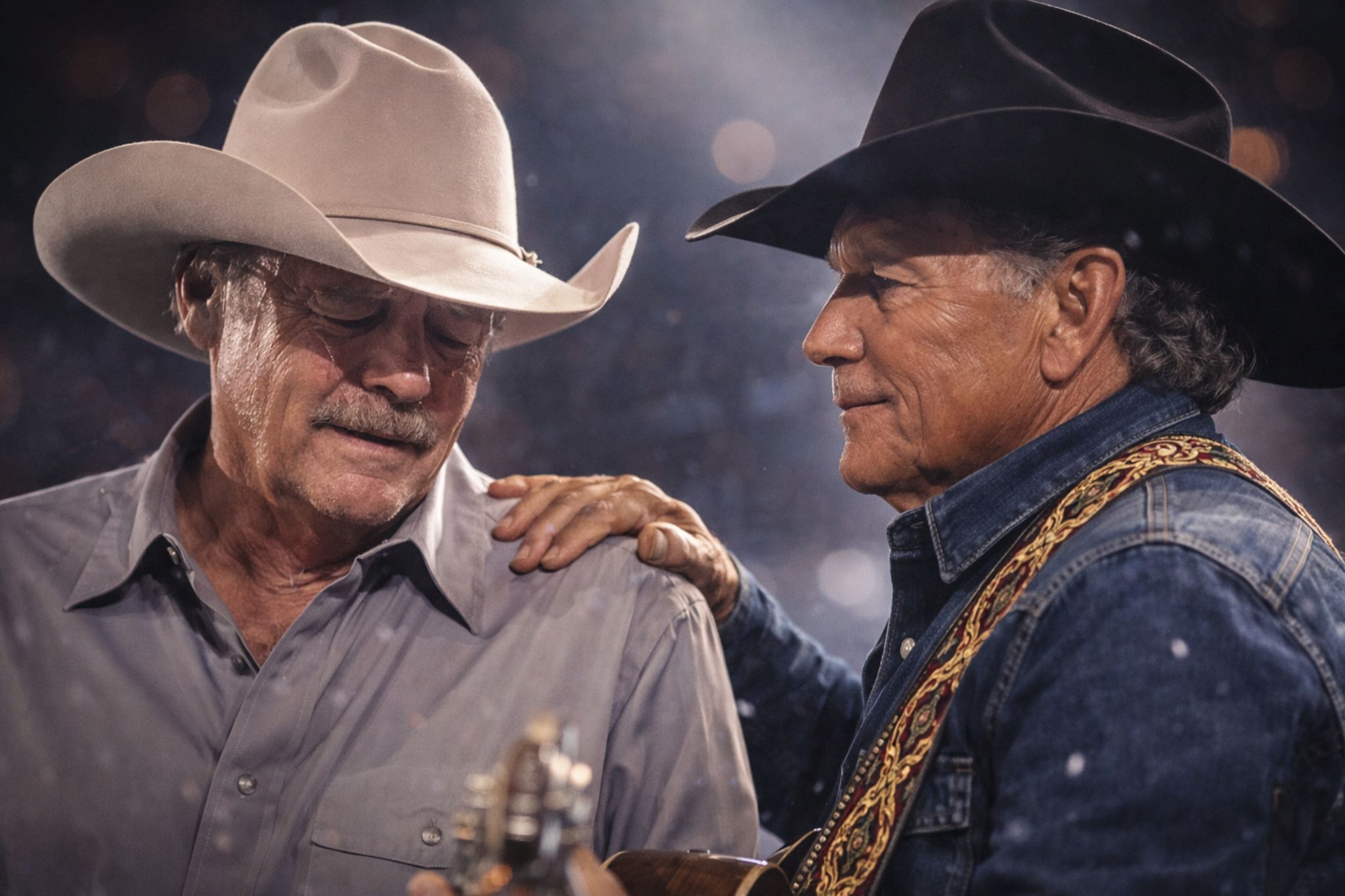 And then the story introduces the figure every traditional country fan recognizes as steadiness itself: George Strait. The narrative calls him “The King” for a reason. Strait represents continuity—an artist who never needed stunts to command a room. In this scenario, he doesn’t rush in with speeches or production cues. He simply appears, locks eyes, and offers a single gesture: a hand on the shoulder. That’s country’s language at its most honest—no flourish, no explanation, just presence.